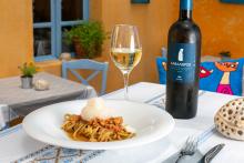 Open all day; with modern aesthetics, breezy from the trees and plants. We offer great service, breakfast, coffee, desserts, snacks and high quality modern Greek/Mediterranean cuisine on top of an extensive selection of approximately 100 Greek wine labels from the volcanic vines of the island and other areas of Greece.