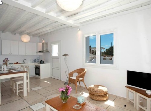 In more details, each house consists of two separate bedrooms, two bathrooms and open plan living room and kitchen. The queen size beds, the bathrooms and the kitchen are built-in according to traditional Mykonos style. The beds have Cocomat mattresses and the linen and towels are of excellent quality. The sofa bed in the living room can easily turn to a comfortable and quality double bed. The kitchen is fully equipped with everything necessary to accommodate up to six people for the preparation of all meals. Also, each house has two 32'' Samsung Smart TVs and free Wi-Fi in all areas. Upon request, you can also have laundry service with extra-charge."