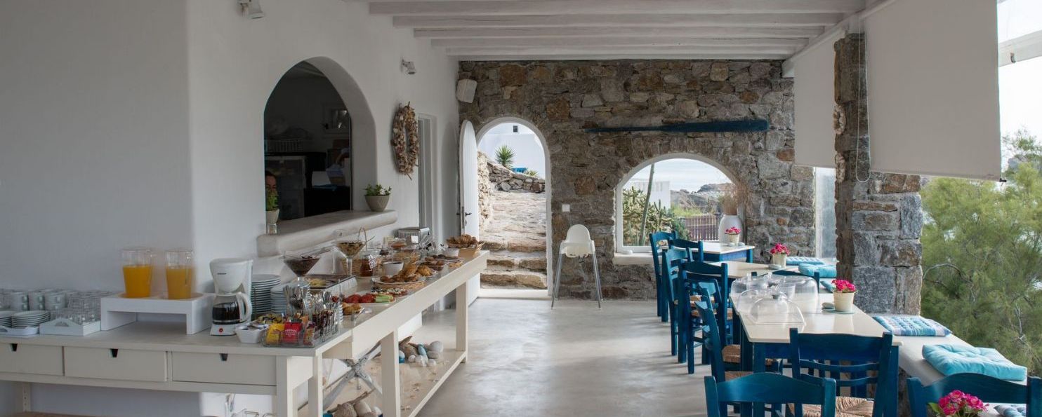 The breakfast veranda overlooks Panormos Bay, offering a buffet breakfast, with homemade specialties.