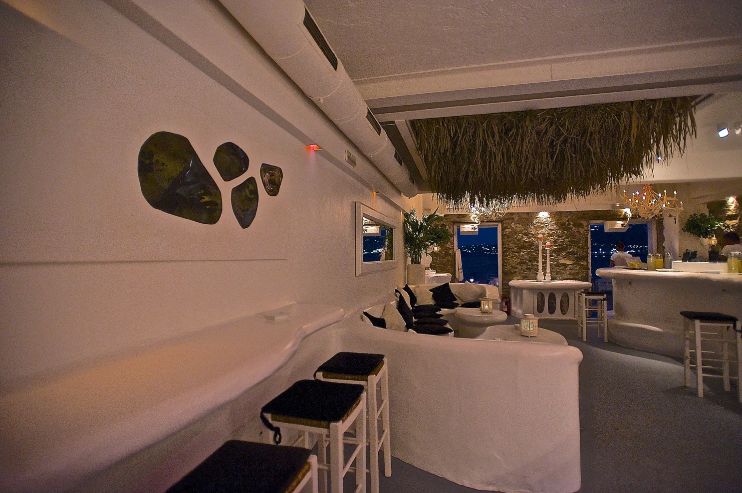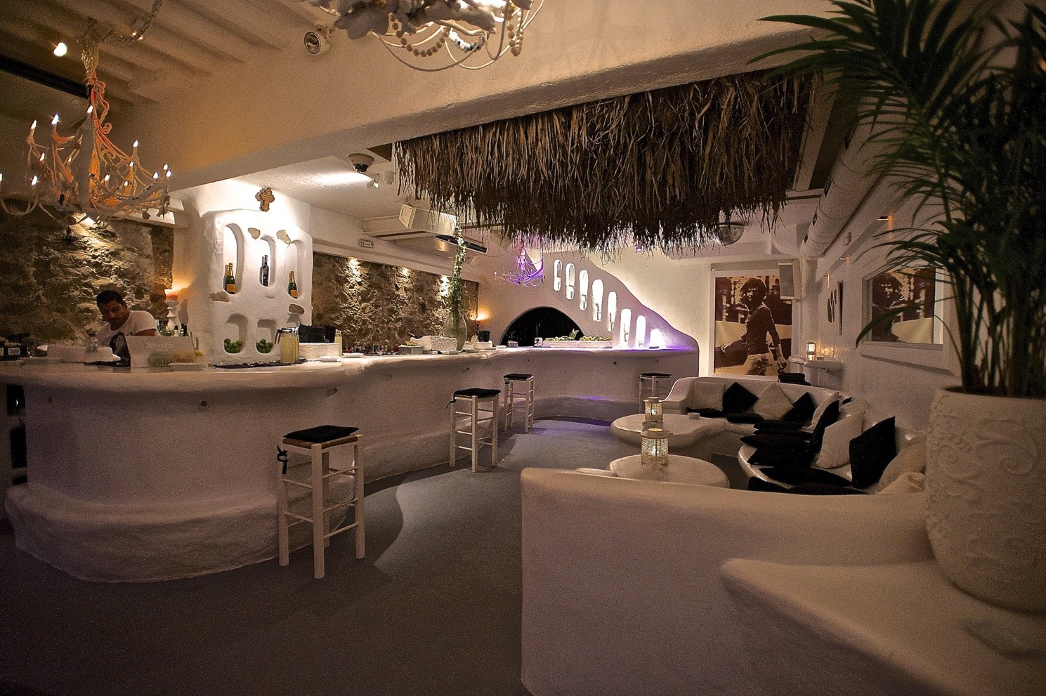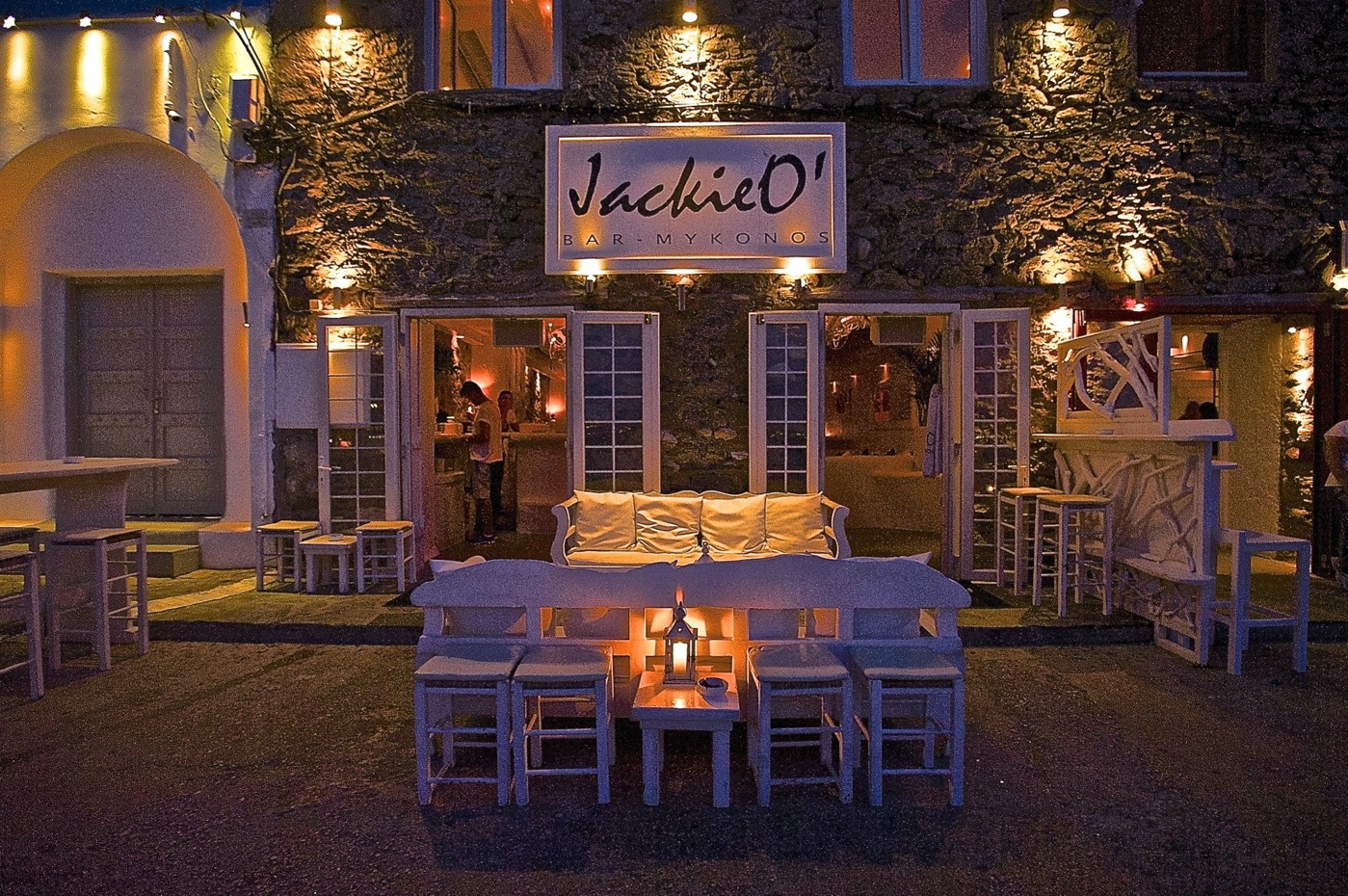 Welcome to JackieO' Bar Mykonos, located right on the seawall of the old harbor of Mykonos, just below the famous church of Paraportiani.