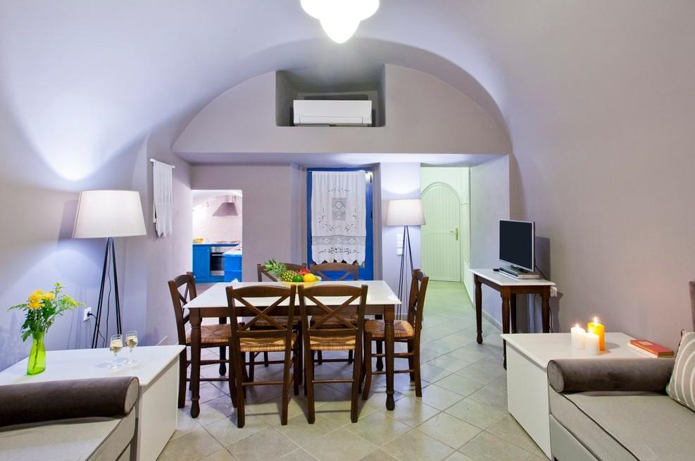 Semeli Cave House is a renovated property that lies in the scenic and traditional village of Exo Gonia - Santorini. It consists of a living room with dining table and TV, a vast bathroom, a fully equipped kitchen, a master bedroom with a double bed and a small sofa and two smaller bedrooms with two separate sofa beds in each of them. The house opens to a spacious patio, with table, chairs and an outdoor Jacuzzi and also offers a terrace with sunbeds and spectacular view.