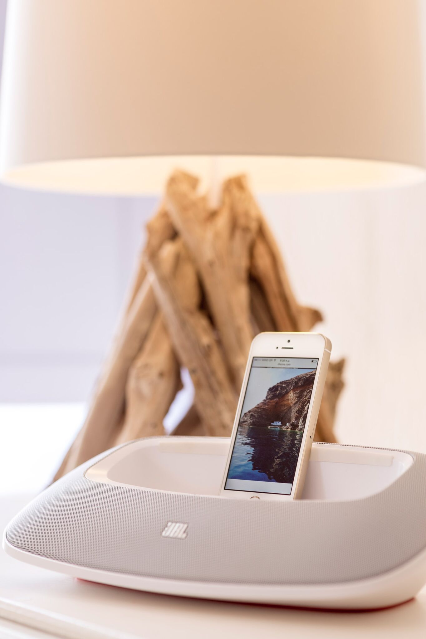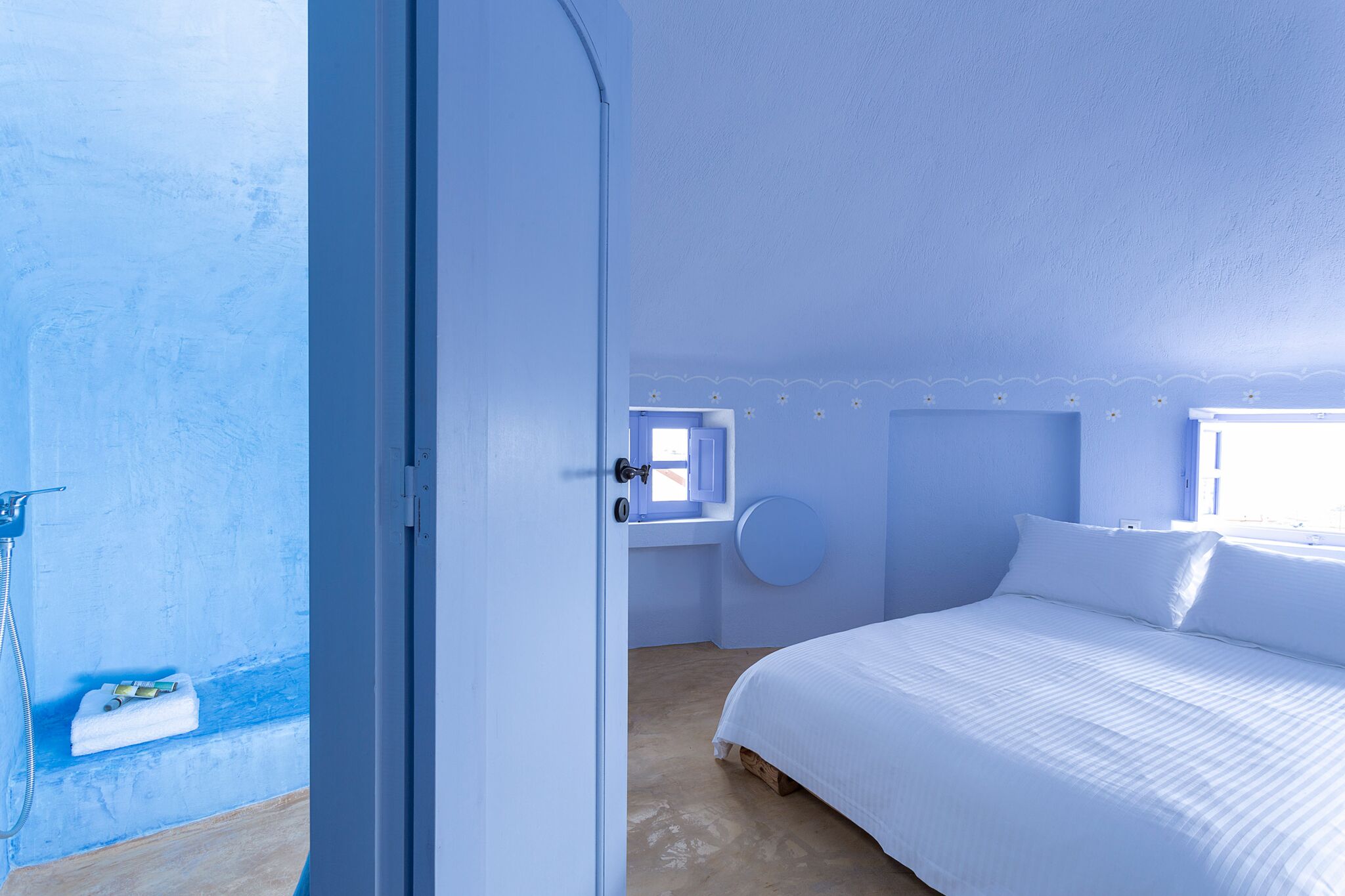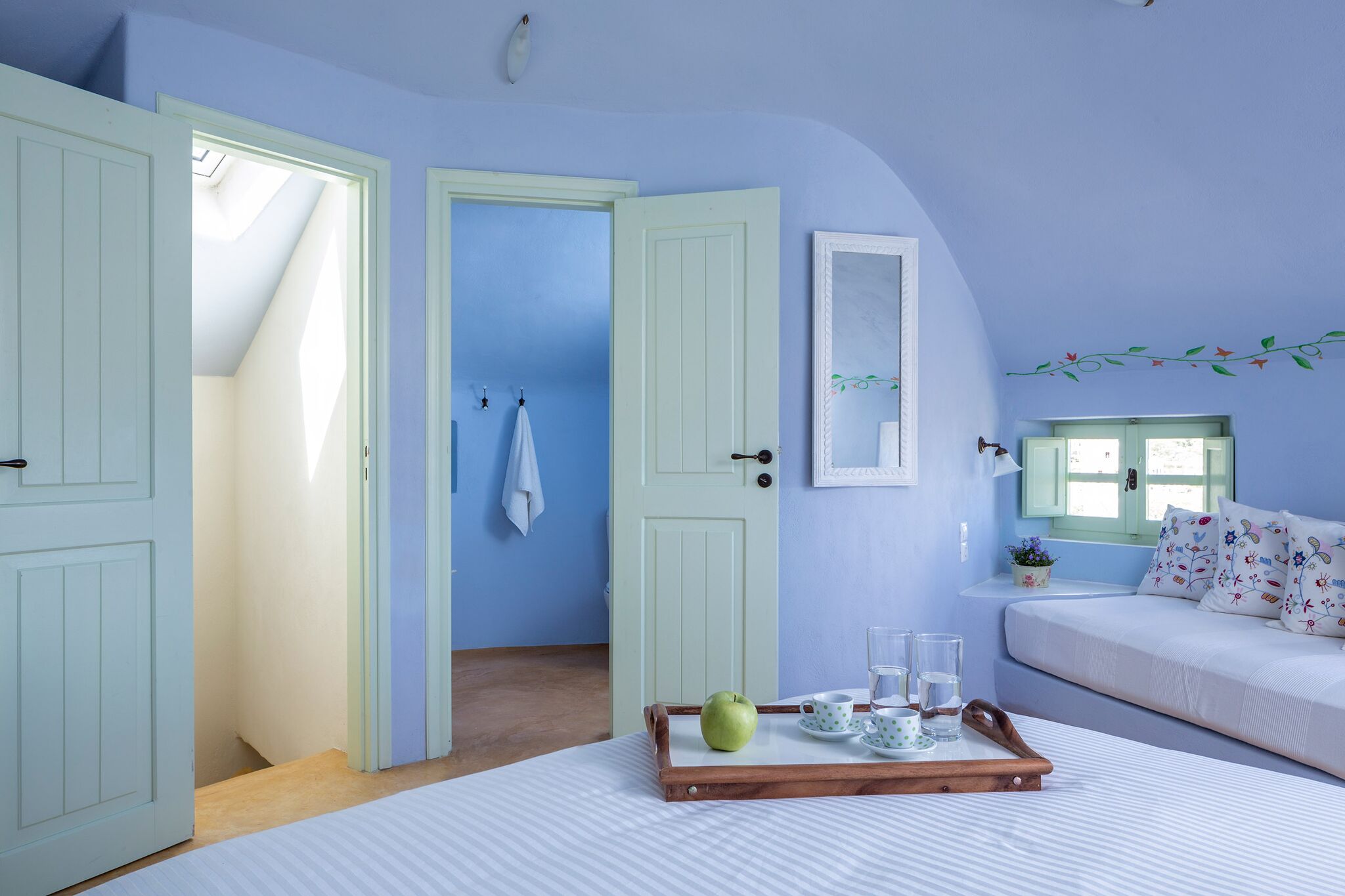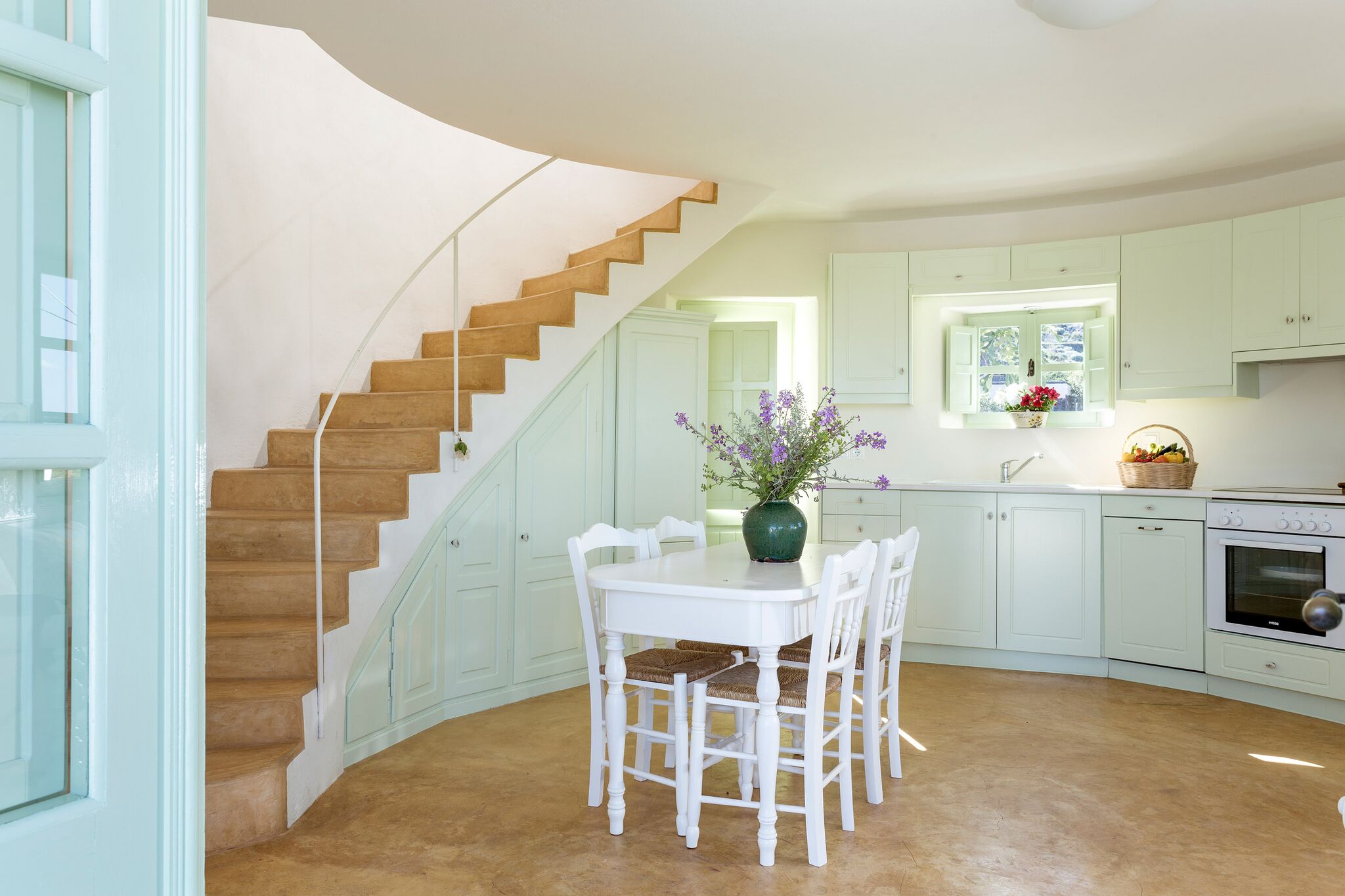 The ground floor with the small luminous windows and the panoramic view of the vineyards, the sea and the swimming pool consists of a living room, a dining room and a fully equipped kitchen. The first-floor bedroom with a romantic ambience features a built double bed and a wonderful en-suite bathroom. The second-floor bedroom is a fabulous cone-shaped room with an en-suite bathroom. This room includes a double built bed and a single one, which can be used as also a couch.