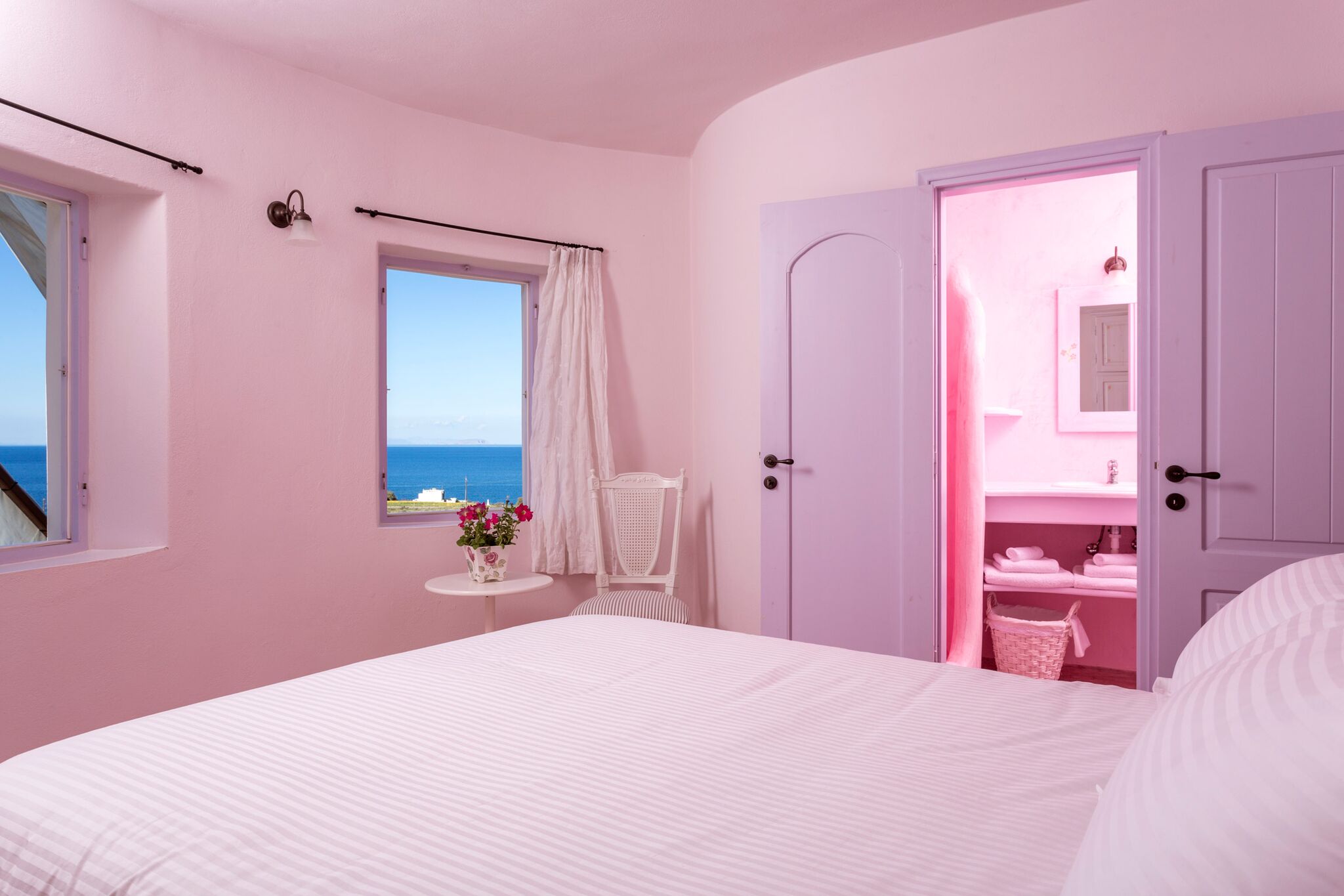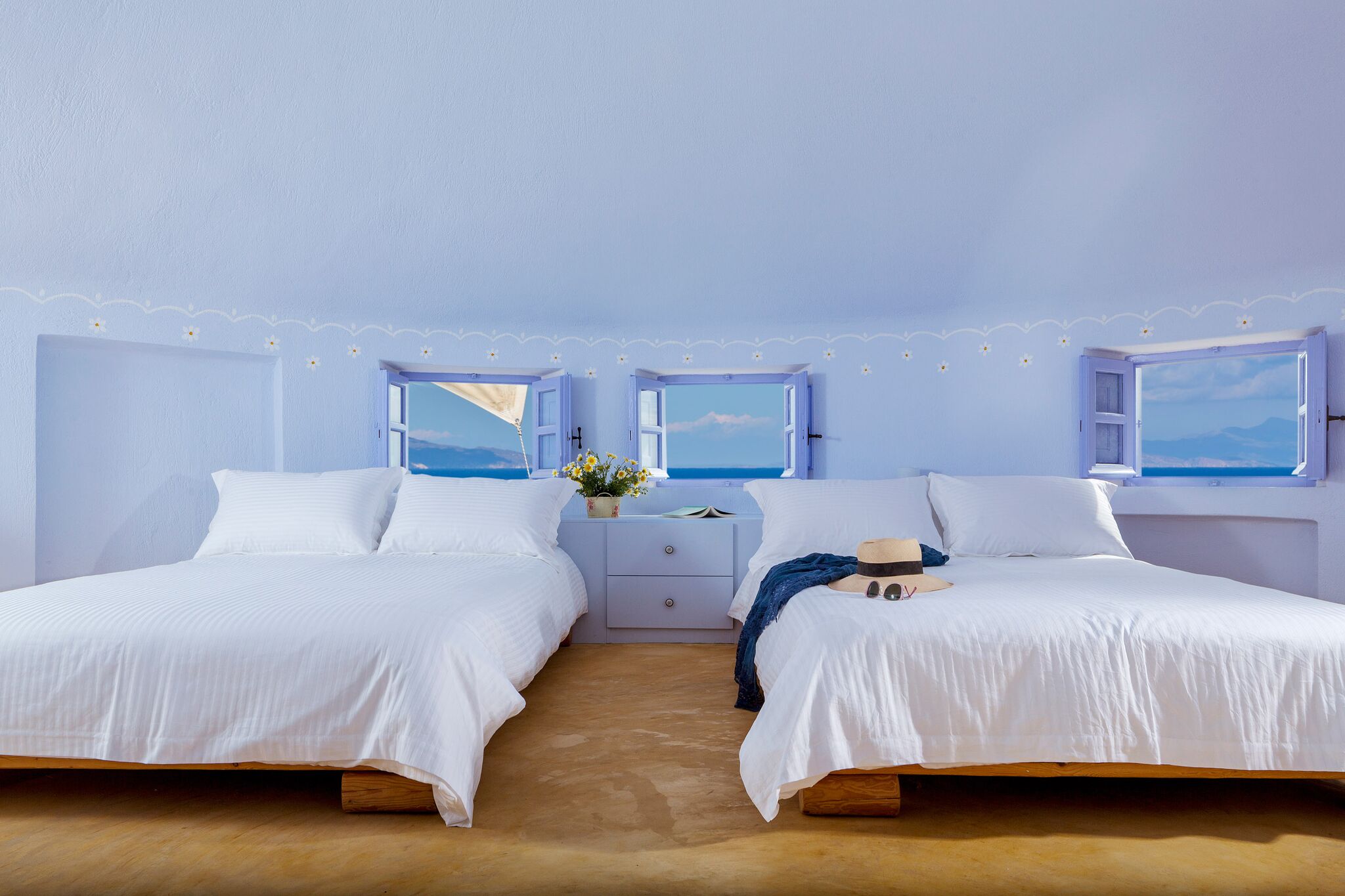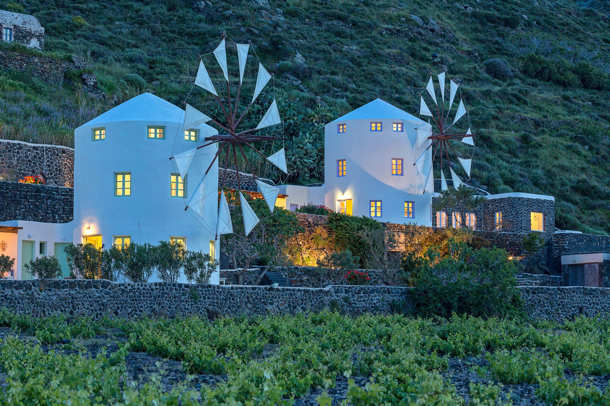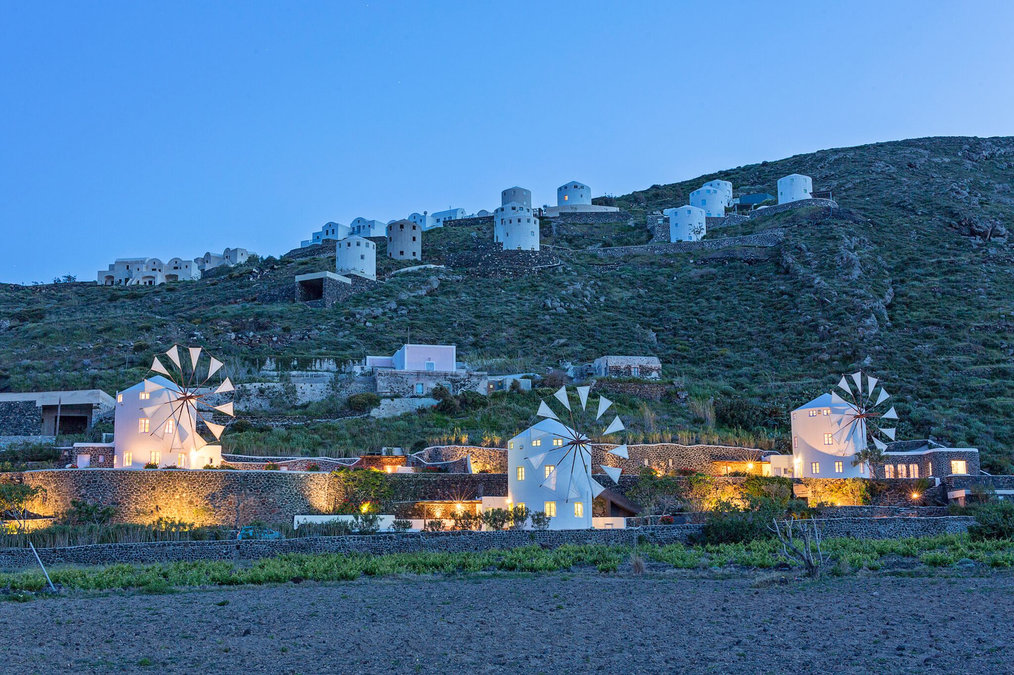 The SANTORINI Windmill Villas is a complex of three new-built similar Luxury Windmills located at the beautiful island of Santorini. The unique, private location of the villas offers panoramic view to the Aegean Sea and the sunrise reflections on the surface of the sea which are visible even from your bed.