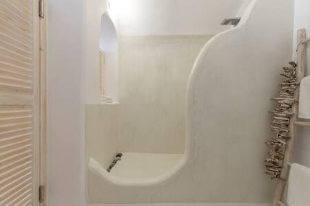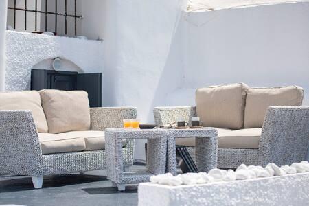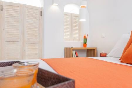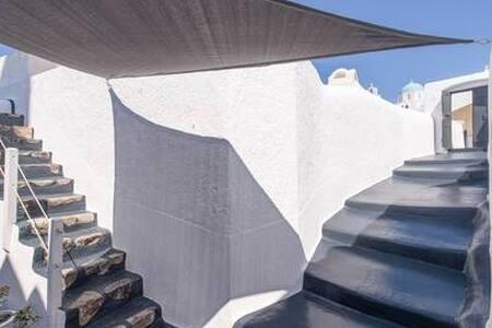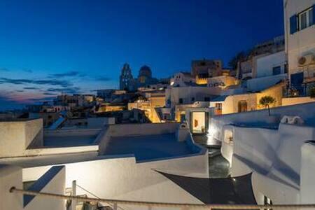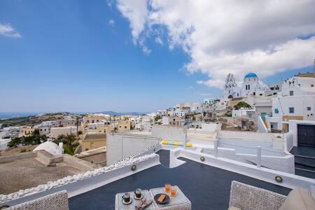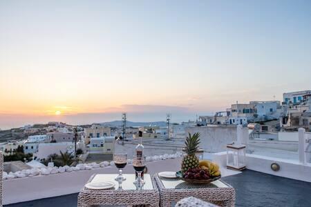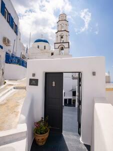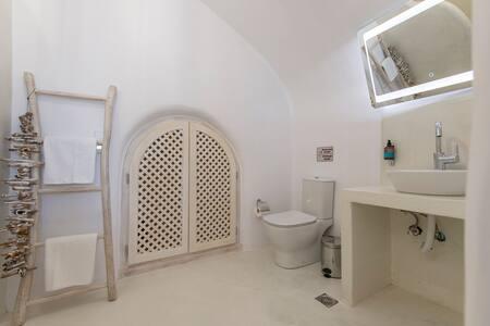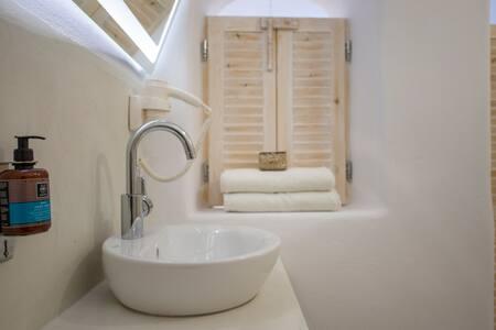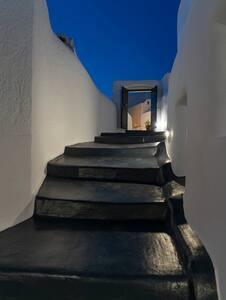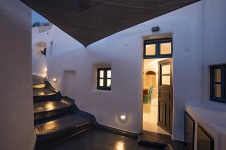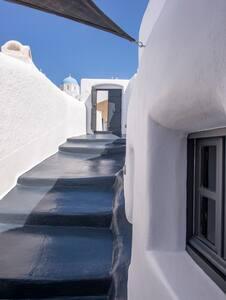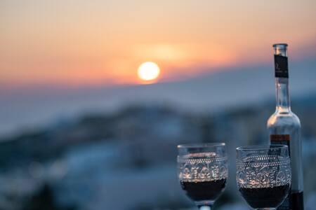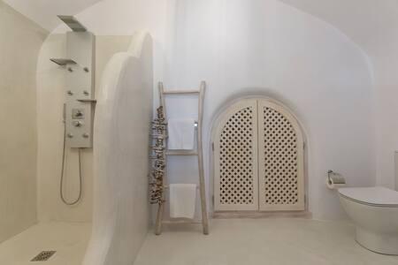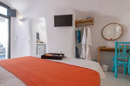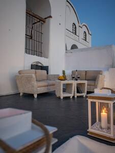 Welcome to our luxury cave studio in the breath-taking village of Pyrgos, Santorini. You will experience an authentic private cave with a king size bed for your comfort and a divine spacious bathroom with an elegant hydro massage shower. From your private roof terrace, you can embrace the spectacular view of the Aegean sea and the famous Santorini sunset away from the crowds. The studio is thoroughly cleaned and steam- aired before each check in and after check out.