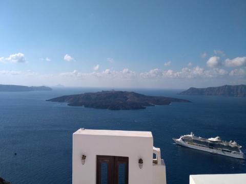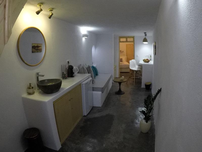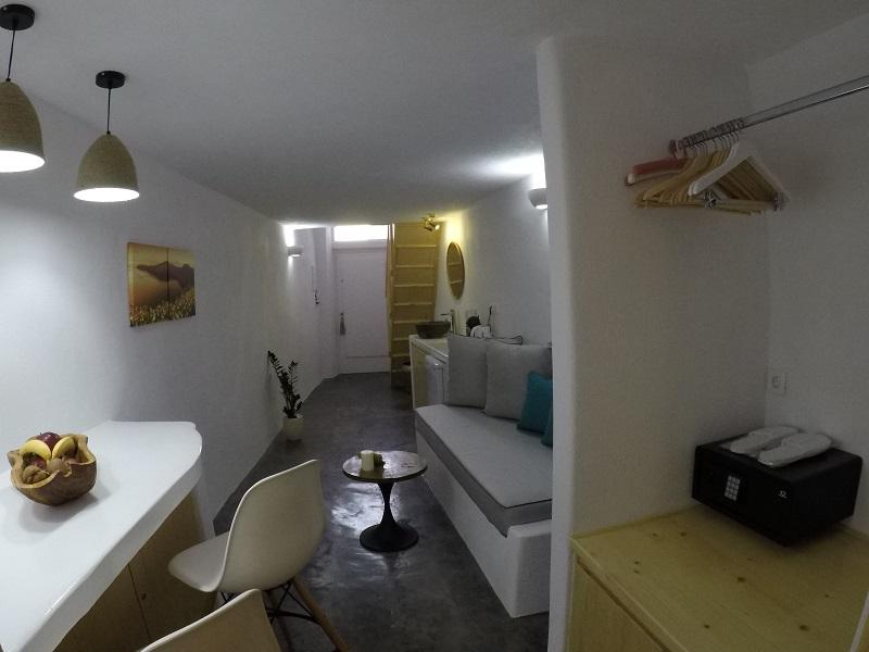 Akron Cliff Suite is a traditional cave suite in Fira , sitting on the edge of the caldera cliff offering panoramic views of Fira Bay and the volcano. Akron Suite was fully renovated in 2016 according to the unique traditional Cycladic architecture combining the minimal style with comfort.