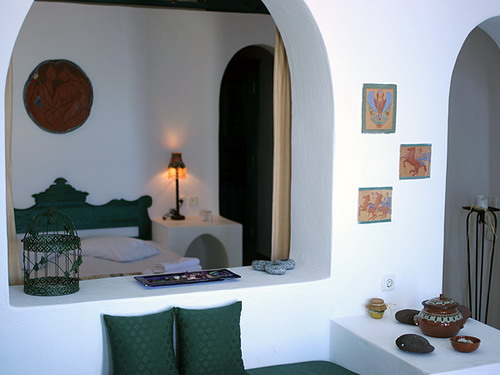 Our ten studios, each with its own unique archway are built on five levels, with their own magical view of Caldera. Each studio is individually decorated giving its own district character, yet maintaining the traditional style. The beds are built into the foundations and the furnishing and decorations chosen so as to enhance the warm and romantic feelings created by the surroundings.