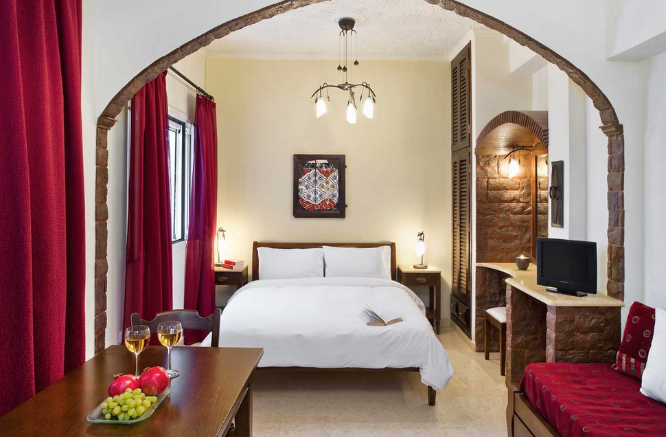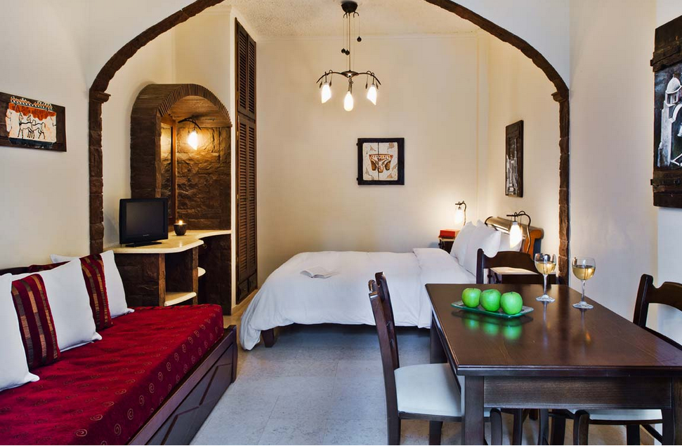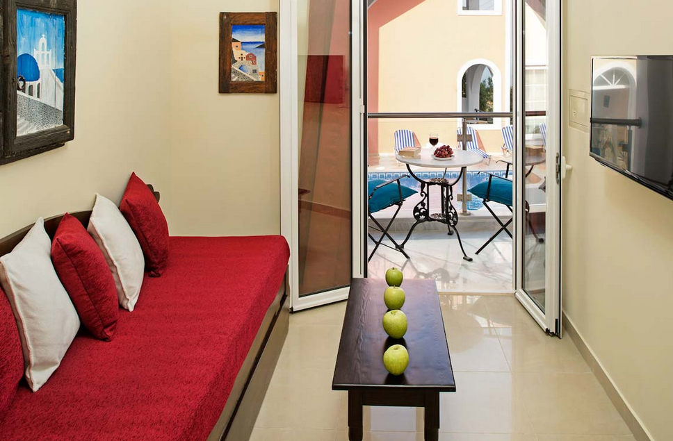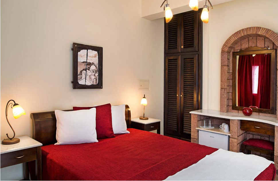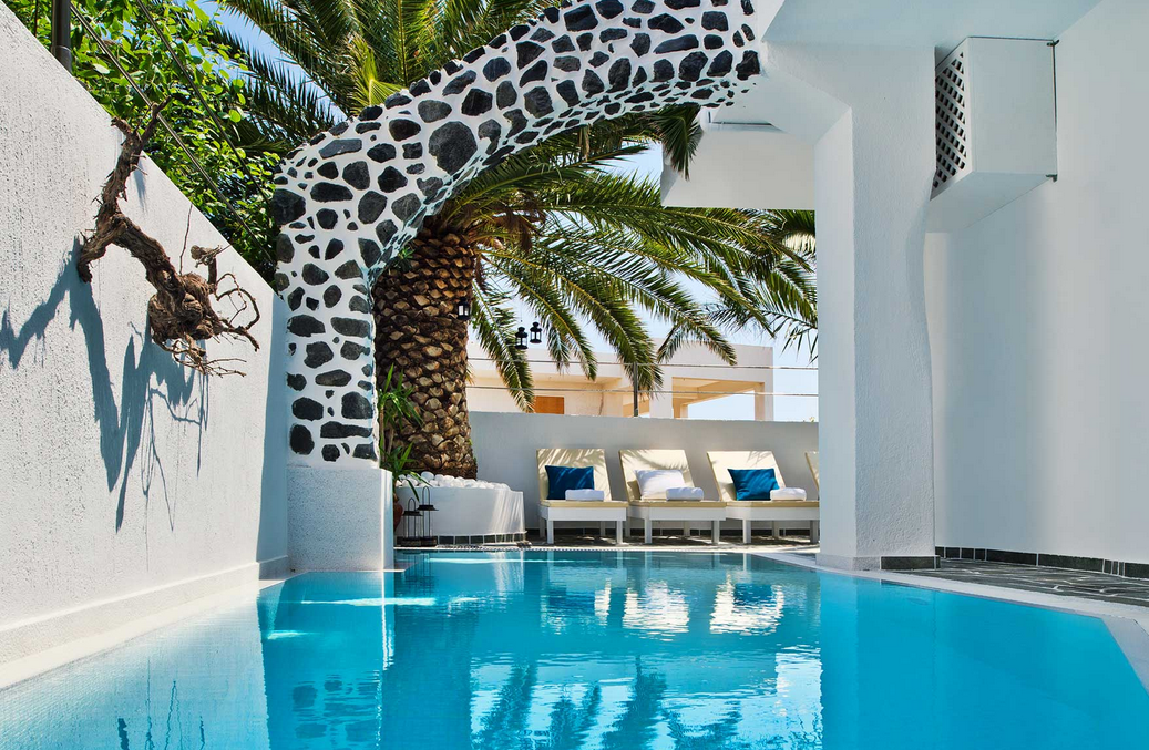 After recent renovation, Galatia Villas in Fira, Santorini transformed into a wonderful and traditional group of rooms and studios with a swimming pool with hydromassage in peaceful lines and elegant architecture with arches and stone details, a lush garden full of scents and colors of geraniums, palms and bougainvillea and comfortable corners that offer carefree hours of relaxation. Breakfast room is a reminiscent of the inside of a traditional island house that derives its decorative themes from the history and beauty of Santorini.