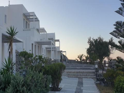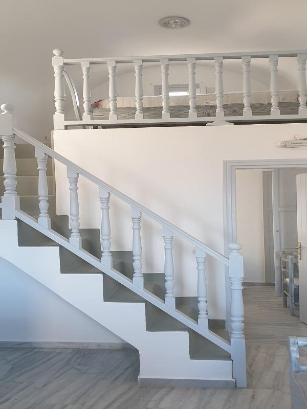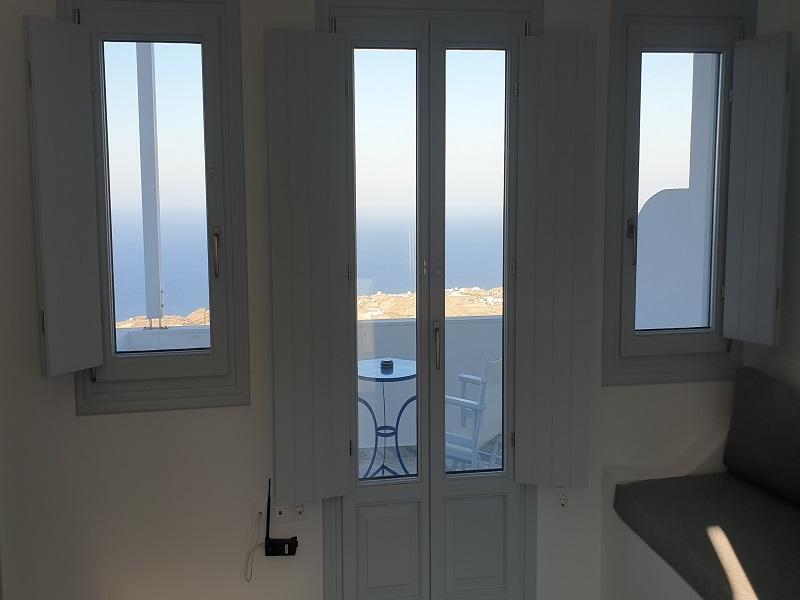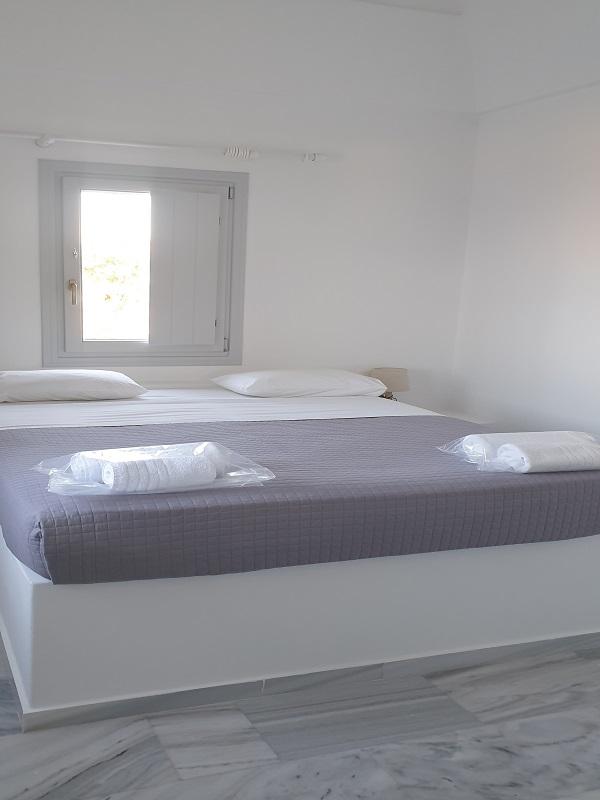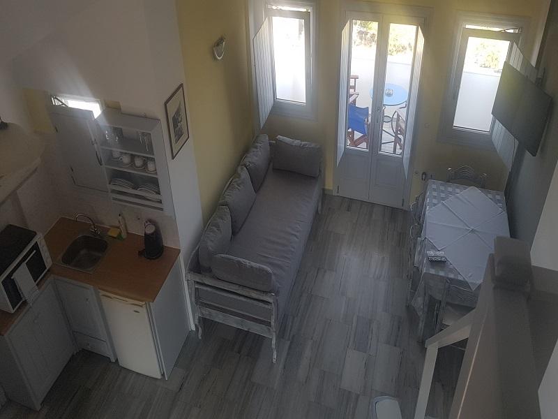 The internal arrangements of the apartments on the southern wing of the complex, is completely different. In the tradition of the island, beds and couches are build in and set the absolute local atmosphere.The apartment's private balcony offers a panoramic view over the eastern flank of the island and the deep blue of the Aegean Sea.