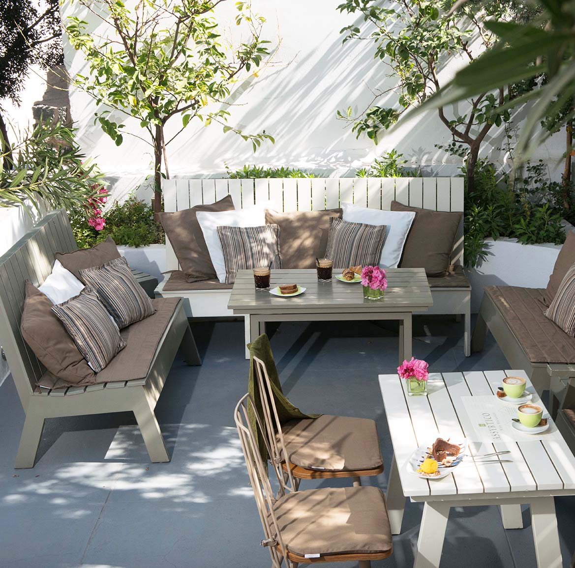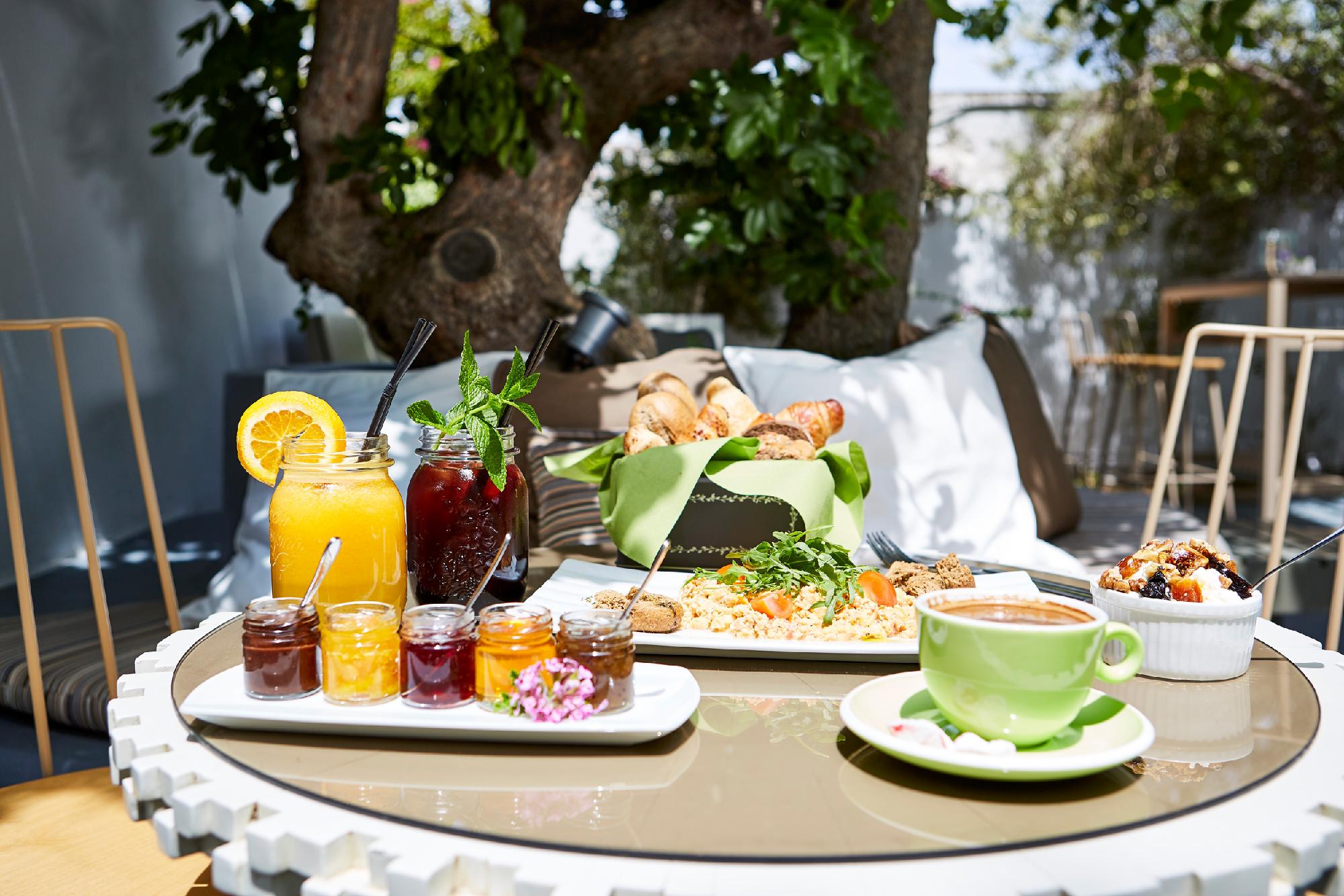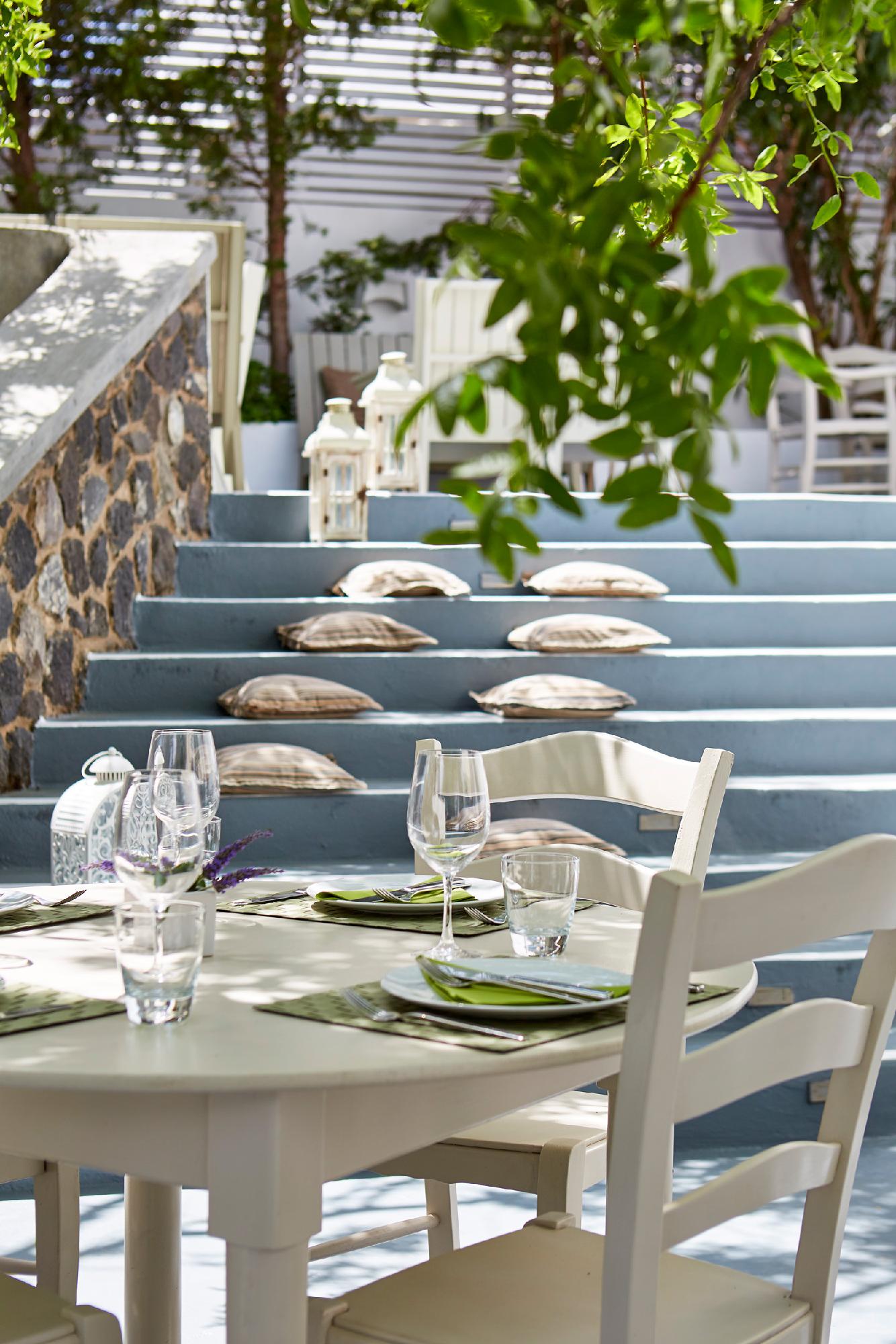 Open all day; with modern aesthetics, breezy from the trees and plants. We offer great service, breakfast, coffee, desserts, snacks and high quality modern Greek/Mediterranean cuisine on top of an extensive selection of approximately 100 Greek wine labels from the volcanic vines of the island and other areas of Greece.
