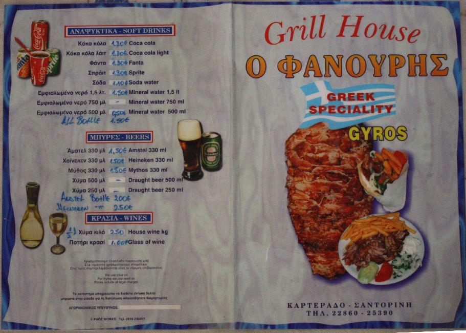 We invite you to enjoy the most delicious "souvlaki" in Santorini. The quality of taste and products we use is guarantied by the 20 years old experience we have in the business. Our grill house is located in the main square of village Karterados, 1.5 km from the center of Fira, the capital of the island. Besides "souvlaki" you can also taste a variety of traditional Greek recipes like "kontosouvli", "giros" etc either in our friendly environment either in a "take away" package. We are waiting for your company.