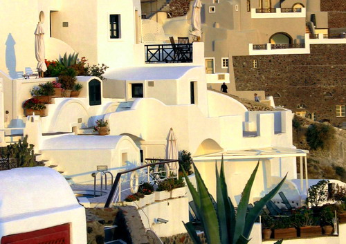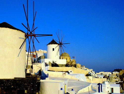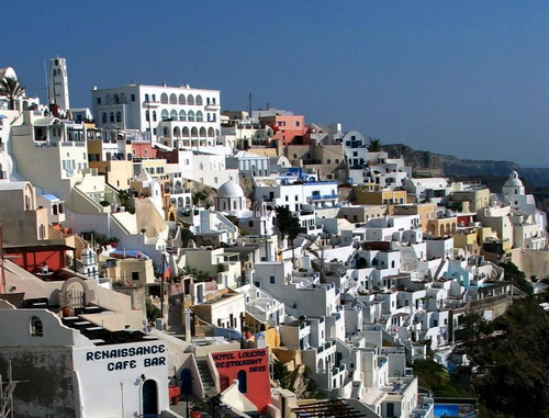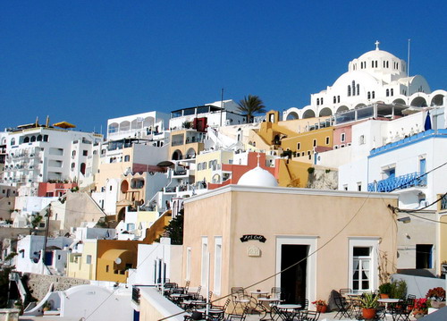 Santorini has a population of 7,000 concentrated in roughly 10 villages. Fira, the capital, and Oia, one of the prettiest villages in the Cyclades, are renowned for their sunsets. The "black" beaches with the sheer cliffs and the volcanic soil add to the island's unique landscape. ZH